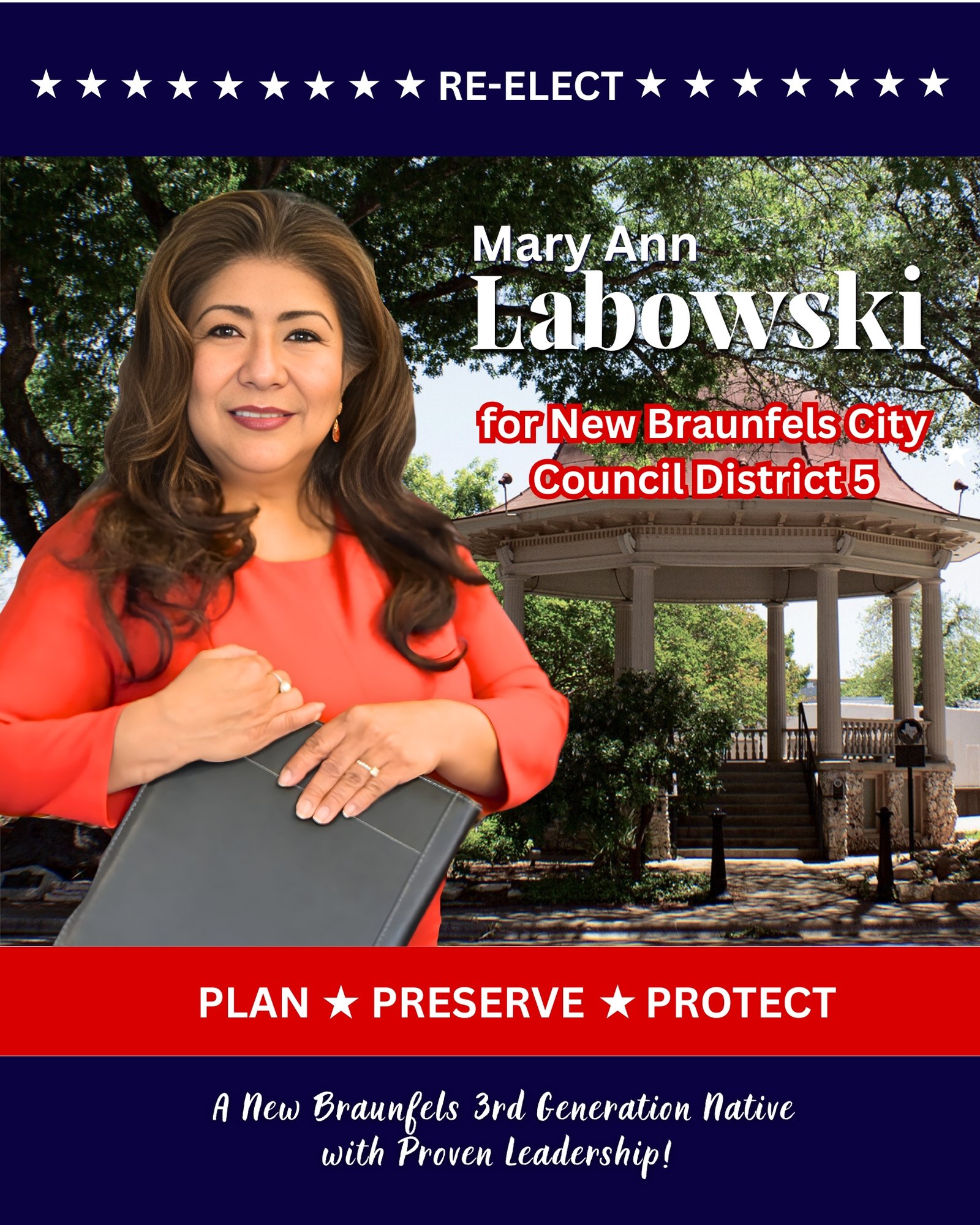 My name is Mary Ann Labowski and I am the sitting District 5 Councilwoman. Before I request your support for my re-election and before I tell you where I stand and what I’m fighting for, I want you to know something far more important…I am one of you! I was born and raised in this city, I’ve built my family here, and when I look at the future of New Braunfels, I don’t just see policy or politics. I see my children and grandchildren’s hometown. I see our City’s future…and that impacts everything about the way I show up for this community.